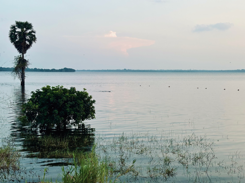 Pour contempler le coucher du soleil, je n'ai eu qu'à marcher quelques minutes pour me retrouver sur la rive du Nuwara Wewa. Ce réservoir artificiel, appelé “wewa”, fait partie des centaines de lacs construits dans la région il y a plus de 2 000 ans pour alimenter la ville en eau et irriguer les cultures, témoignant une fois de plus du génie hydraulique de l’époque. Sur place, quelques locaux se baignaient ou se lavaient, dans une ambiance paisible. Je suis resté en retrait, le temps d’observer le soleil disparaître lentement, teintant le ciel de nuances rosées. Au loin, les silhouettes des stupas de l’ancienne cité royale se dessinaient dans un axe parfaitement aligné avec le disque solaire évanescent. Un instant suspendu.