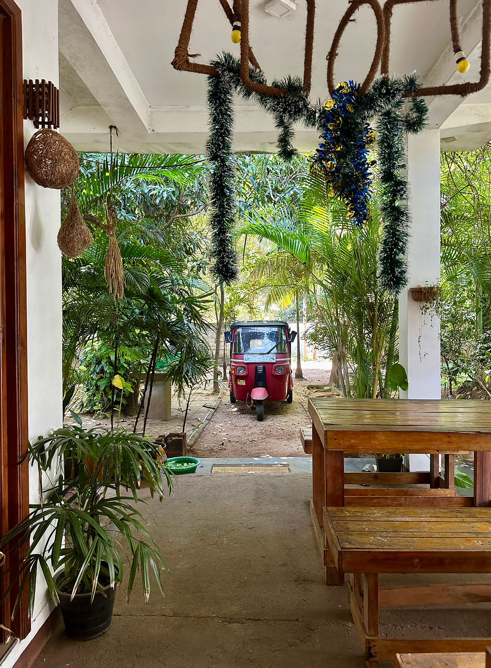 Pour quitter cet endroit isolé et repartir à Matale, je suis parvenu, au bout de quatre tentatives, à trouver un chauffeur de tuk-tuk sur PickMe, l'équivalent local de l'application Uber. Une fois de retour sur la route principale de la ville, je suis monté dans un bus qui m'a ramené à Dambulla. Arrivé à la gare routière, je suis monté à l’étage pour aller déjeuner dans un petit restaurant discret, le Lamtharuma Restaurant. Le service y était très attentionné et la cuisine réconfortante et savoureuse. Au menu pour moi : des nouilles végétariennes accompagnées de saucisses et d'un jus d'ananas bien frais.
