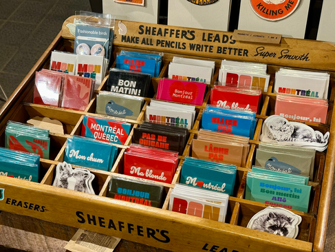 Puis, nous avons emprunté la rue Saint-Paul, véritable artère commerçante du Vieux-Montréal. Cette rue pavée, bordée de bâtiments à l’architecture ancienne, est l’une des plus charmantes de la ville, avec ses nombreuses boutiques et restaurants. Nous avons pris le temps de nous arrêter dans deux boutiques en particulier : L’Empreinte et le Magasin Général. Elles regorgeaient de souvenirs originaux, parfaits pour capturer l’esprit du Québec, comme de belles cartes illustrées et des épinglettes — car oui, ici, on ne dit pas “pins” !